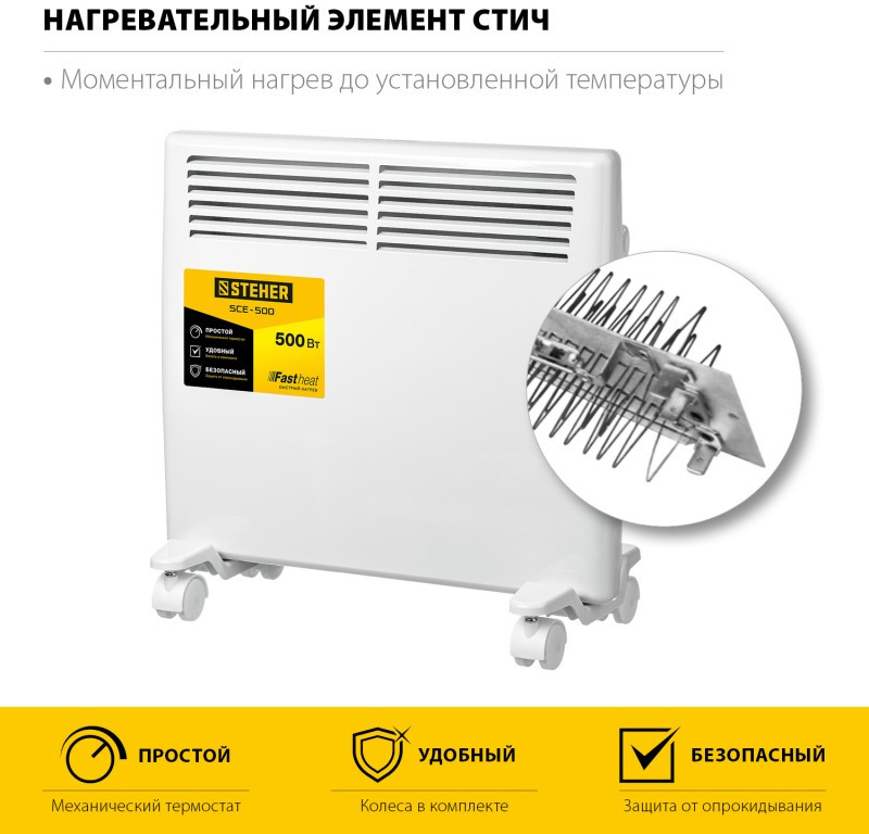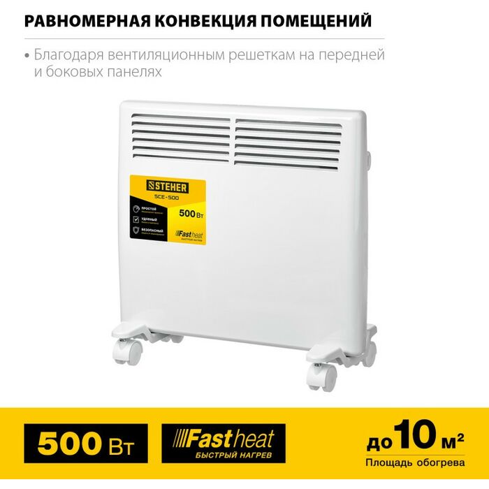 Электрический конвектор STEHER мощностью 500 Вт - подойдет для обогрева любых домашних и офисных помещений площадью до 10 м2.