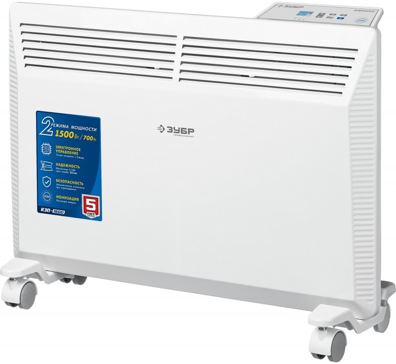 - Электрический конвектор ЗУБР ПРОФЕССИОНАЛ мощностью 1500 Вт - подойдет для обогрева любых домашних и офисных помещений площадью до 20 м2. Электронный терморегулятор и ионизация воздуха обеспечит равномерный нагрев помещения и создаст неповторимую атмосферу комфорта.