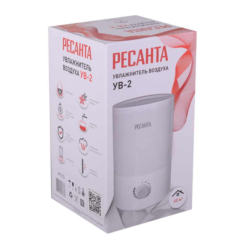 Ресанта УВ-2 – модель увлажнителя воздуха ультразвукового типа для помещений площадью до 40 м² с механической регулировкой влажности. Принцип увлажнения основан на работе ультразвуковой мембраны, превращающей воду из резервуара в мелкодисперсный пар, насыщающий воздух в помещении и повышающий его влажность. Выход мелкодисперсного холодного пара осуществляется порционно через специально предусмотренное сопло. Мощность модели Ресанта УВ-2 – 25 Вт. Производительность – 300 м³/час. Объём резервуара для воды – 3 л.