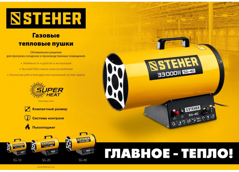 • Газовые тепловые пушки STEHER - мощные теплогенераторы, работающие наиболее распространенном виде топлива. Компактный корпус, контроль наличия пламени, биметаллический термопредохранитель и двойное теплоэкранирование. Оптимальное решение для прогрева складских и производственных помещений.