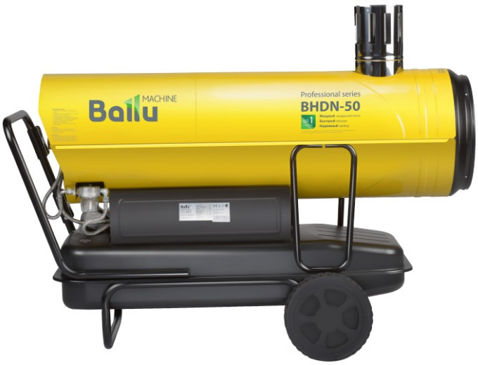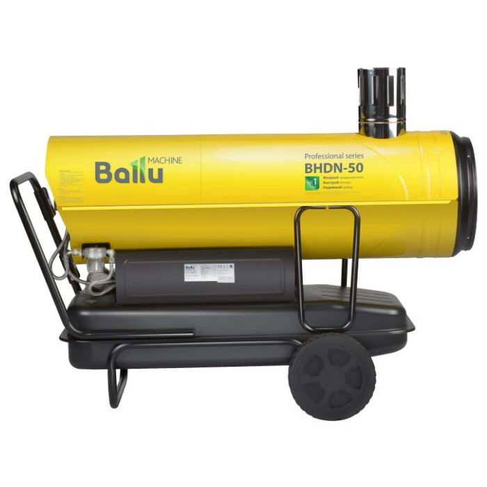 - Тепловая пушка дизельная Ballu BHDN-50 серии Tundra непрямого нагрева – мощный обогреватель с объемом бака 68 литров, рассчитанный на эффективный обогрев помещения площадью до 500 м²