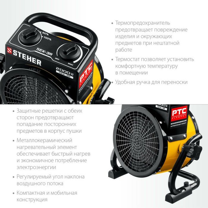 Электрические тепловые пушки STEHER серии SEK – компактные пушки в круглом корпусе для обогрева небольших помещений. Благодаря небольшим размерам тепловую пушку легко переносить и хранить. Устройства оснащены долговечным металлокерамическим нагревательный элементом,обеспечивающий быстрый равномерный нагрев, экономное потребление электроэнеергии и не сушит воздух. Механический терморегулятор поддерживает нужную температуру нагрева.За счет большой площади теплообмена и небольшой температуры нагрева элемента, воздух быстро прогревается. Изделие можно оставлять на долгое время и не бояться за сохранность помещения, так как конструктивные меры безопасности защищают Вас и изделие при нештатных ситуациях.