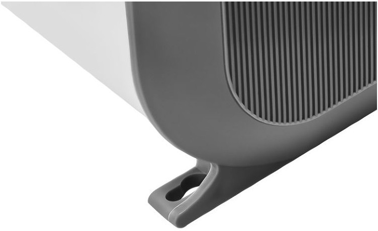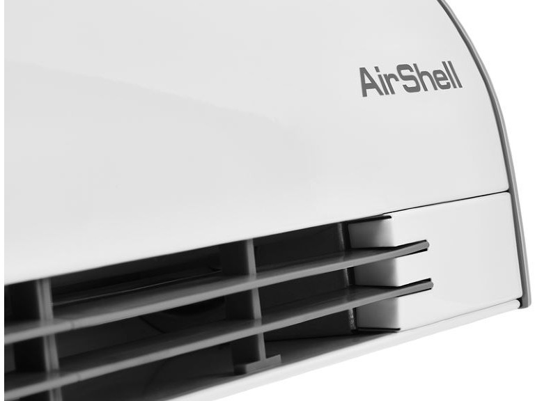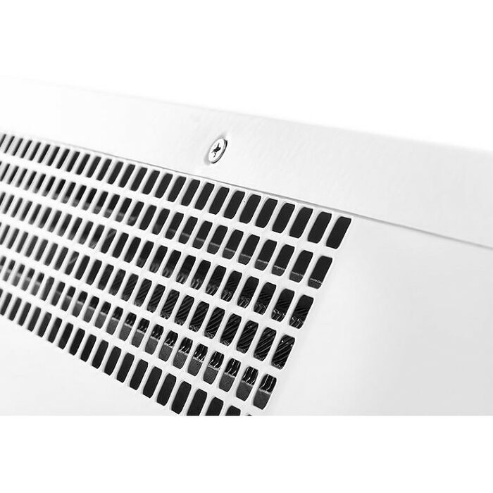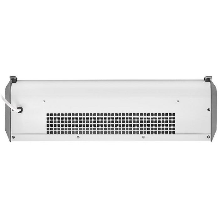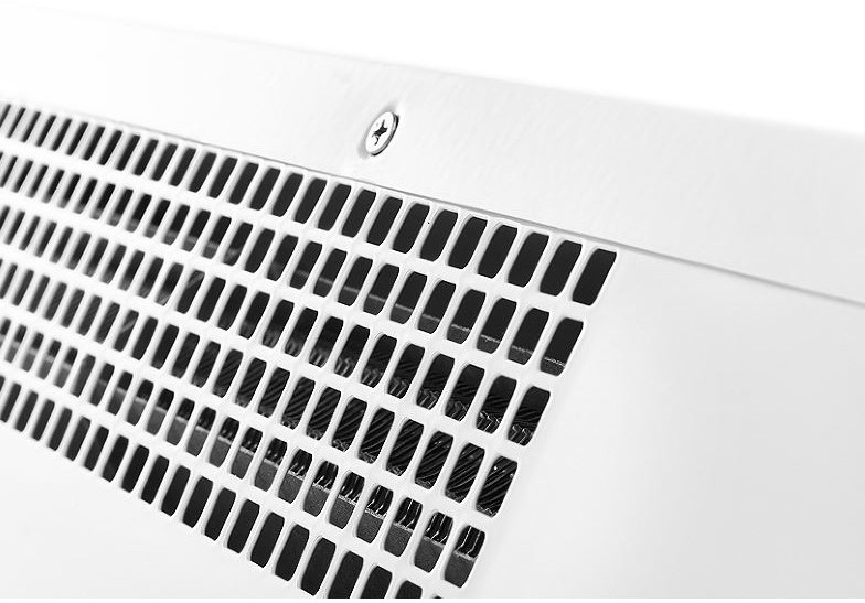 - Передняя панель без перфорации блокирует распространение шума от вентиляционных колес направляя его в потолок а не в проходящих людей, что делает завесу значительно тише аналогов в классическом корпусе