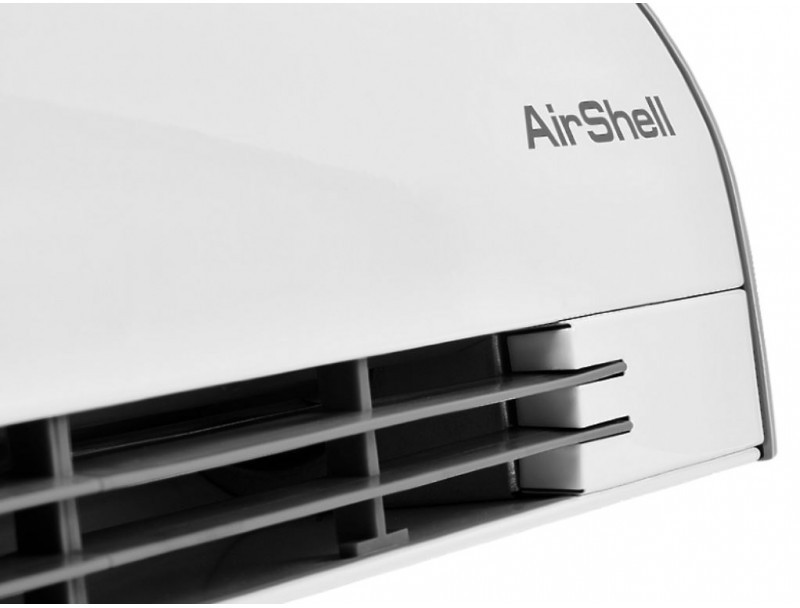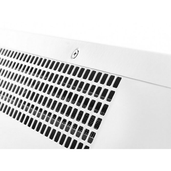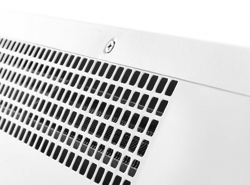 - Передняя панель без перфорации блокирует распространение шума от вентиляционных колес направляя его в потолок а не в проходящих людей, что делает завесу значительно тише аналогов в классическом корпусе