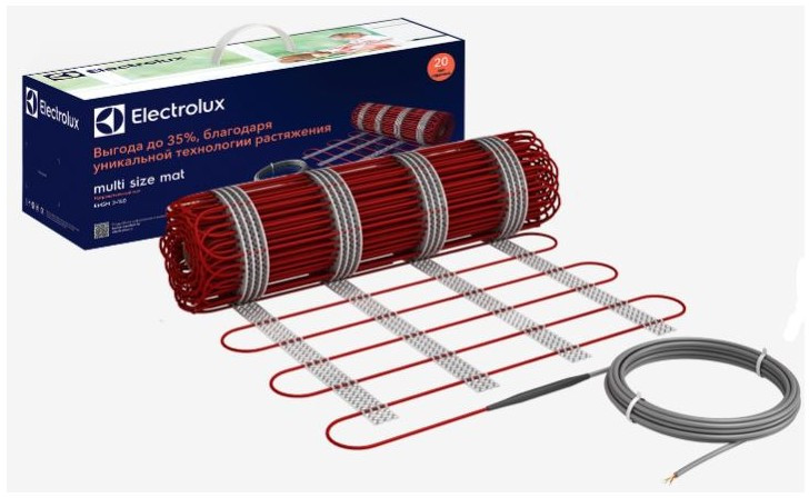 - Тканая основа мата выполнена в виде эластичных полос, позволяющих при необходимости растягивать уложенный мат, увеличивая при этом его длину до 35% от первоначальной длины, при этом пропорционально меняется мощность мата на единицу площади укладки. Изменяемый диапазон мощностей мата от 150 Вт/м² до 111 Вт/м² открывает новые возможности для оптимального обогрева пола в помещении любого типа. Кроме того, уменьшение мощности позволяет использовать мат для монтажа в стяжку под деревянные покрытия пола. При желании мат можно растягивать только на определенных участках, формируя, таким образом, локальные зоны с разной интенсивностью нагрева