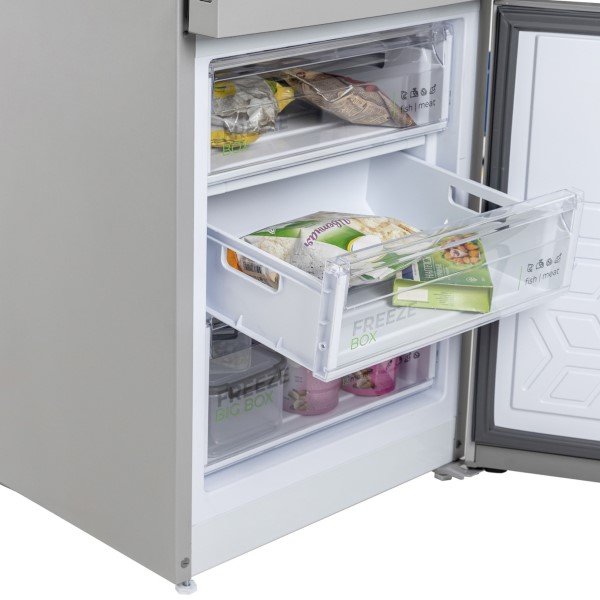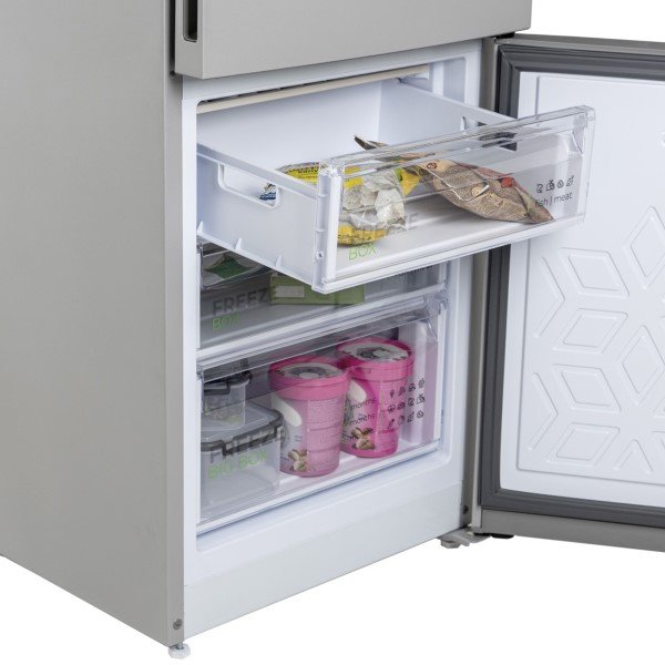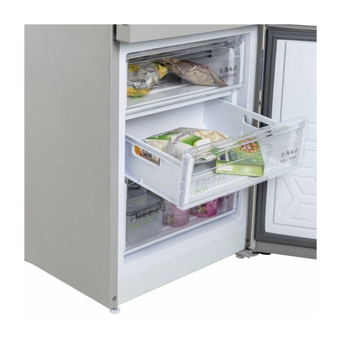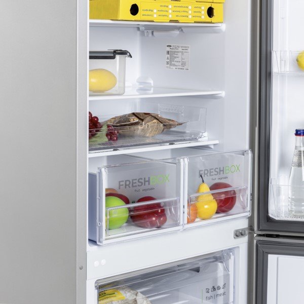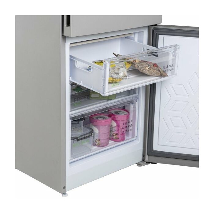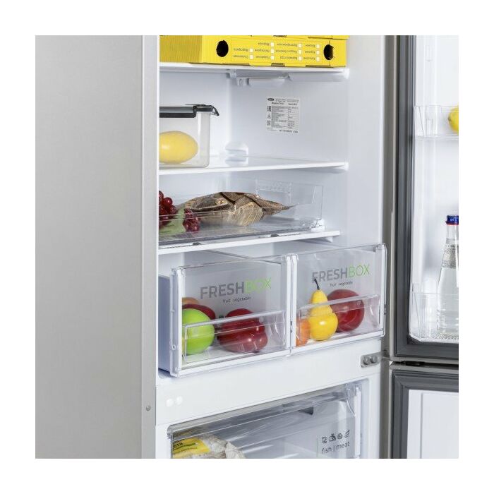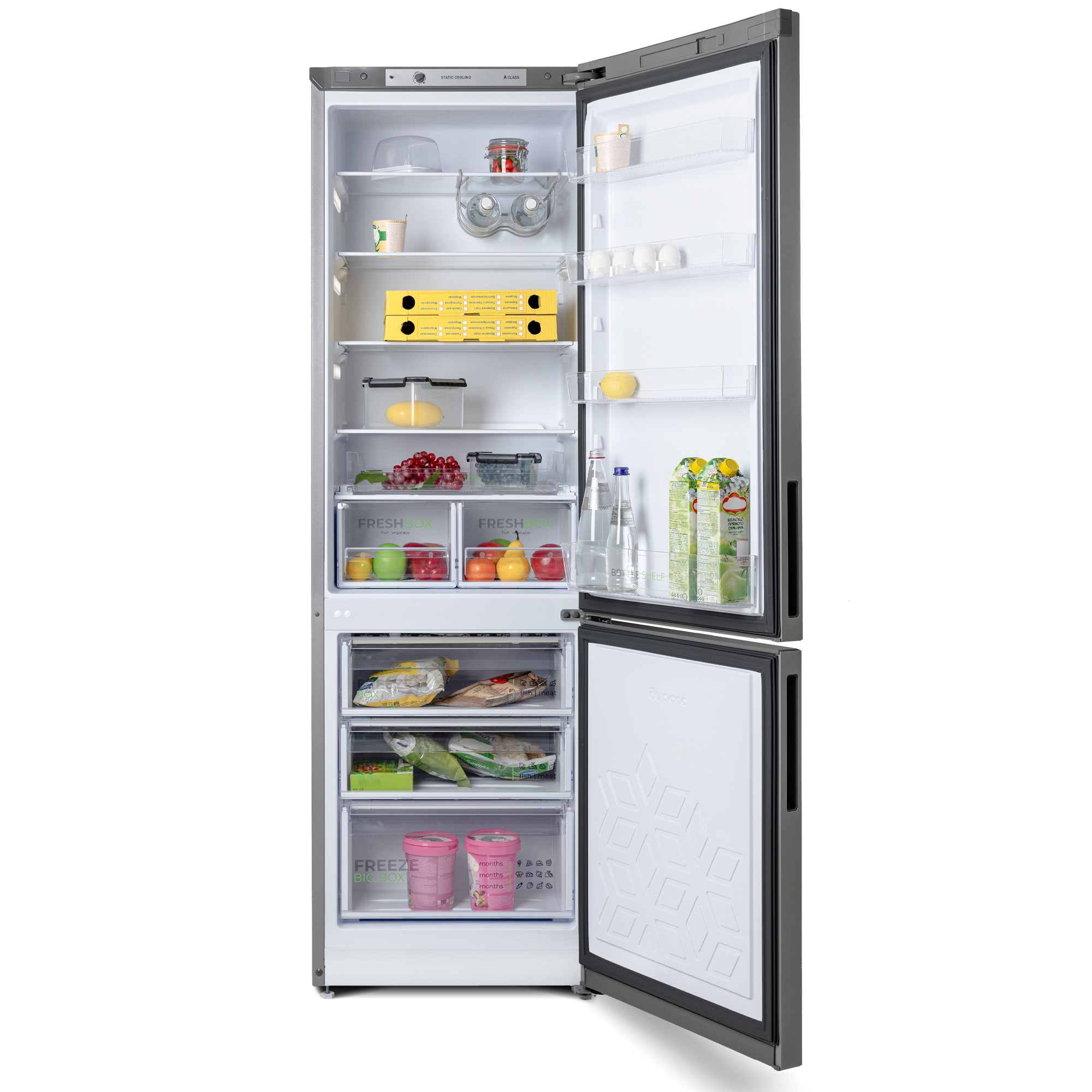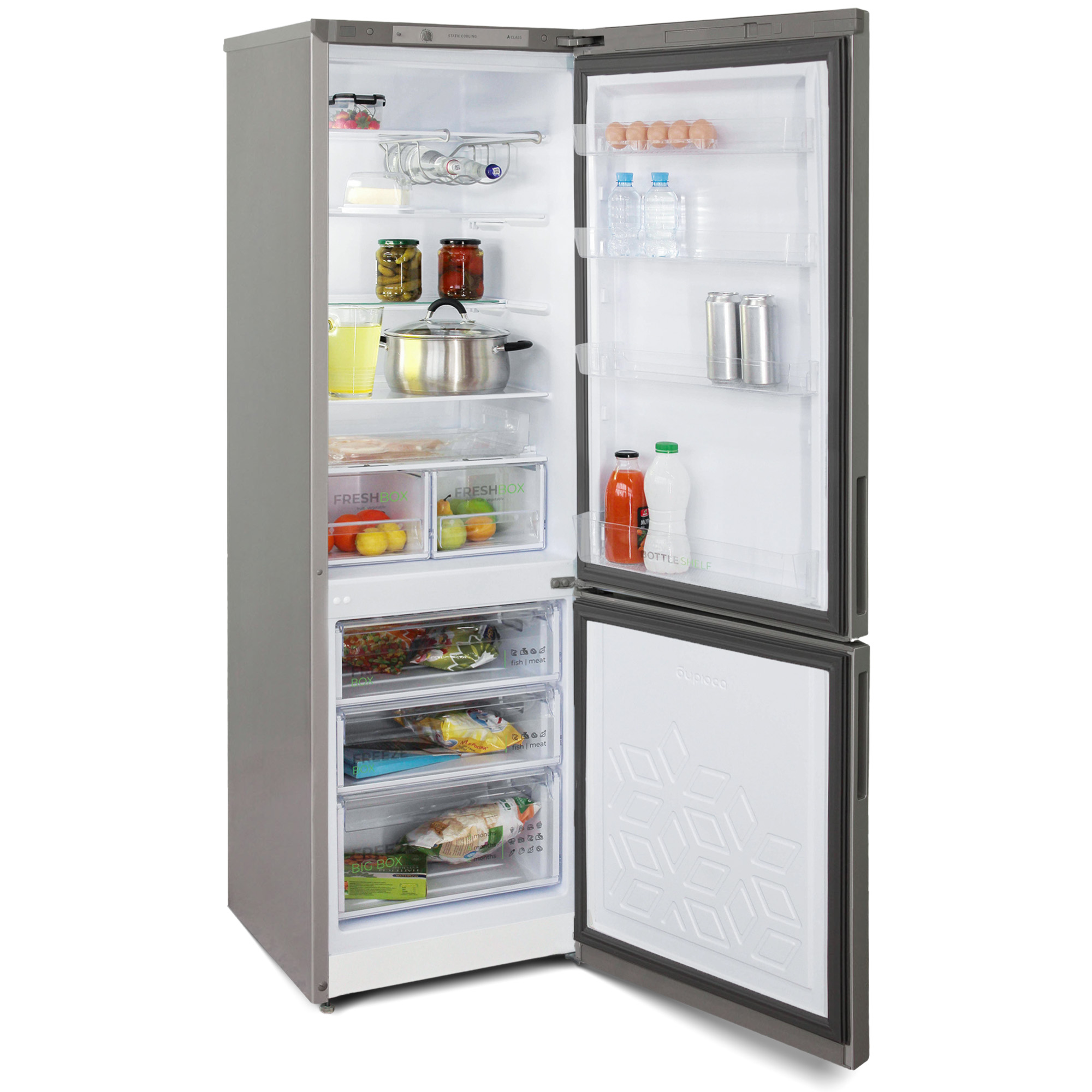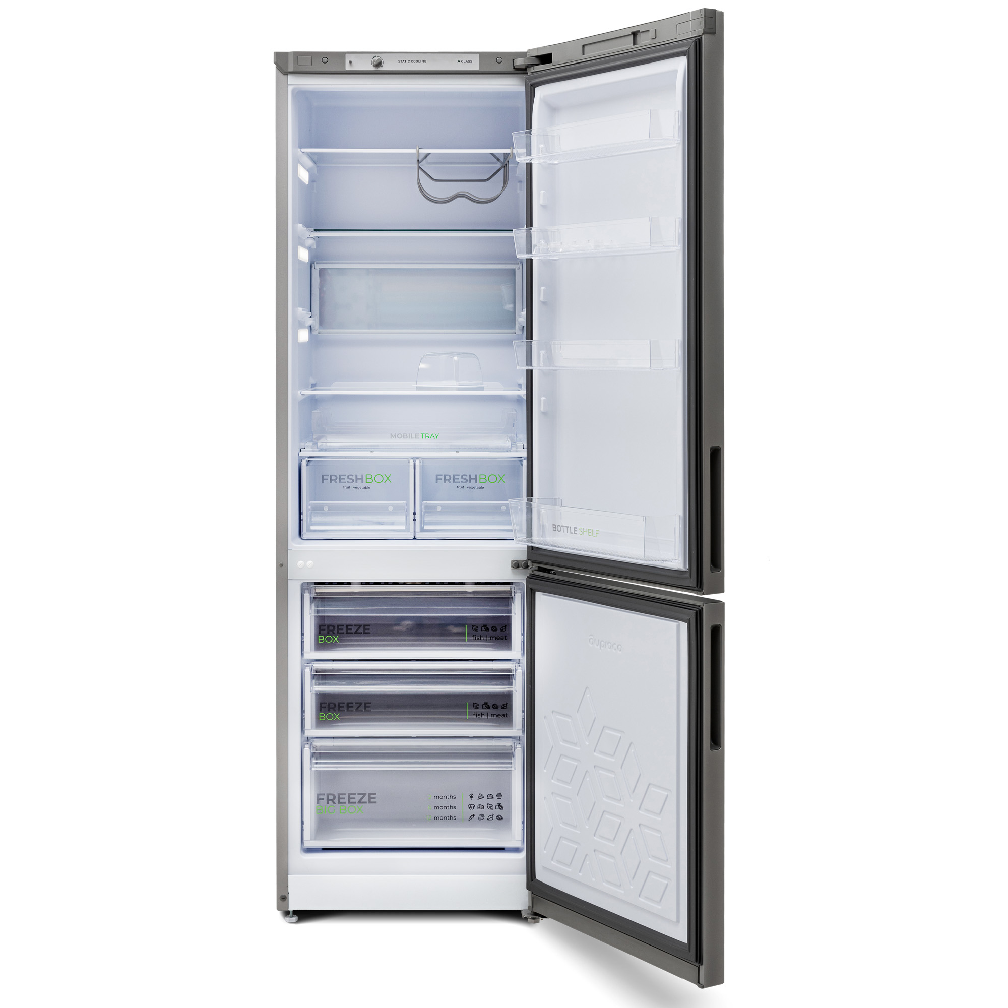 Холодильник Бирюса М6127, объем холодильной камеры 245 л, морозильной камеры 100 л, цвет металлик. Энергопотребление класса A+, уровень шума до 41 дБ, система охлаждения статическая, габариты (ВхШхГ): 186x60x63 см, удобные стеклянные полки и ящики для хранения овощей и фруктов.