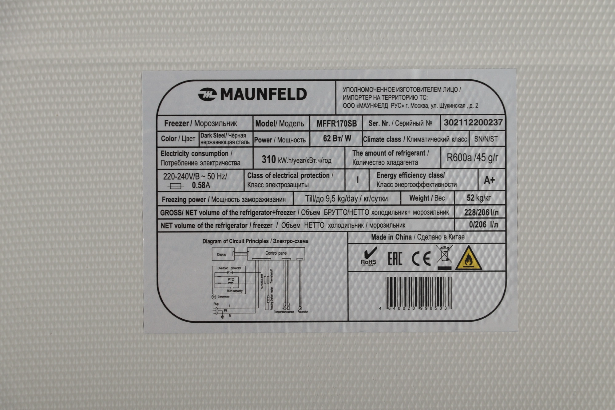 Объем морозильной камеры206 л