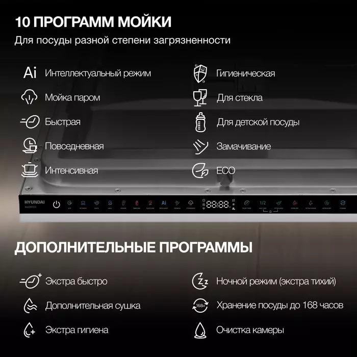 | Программы | Интеллектуальный режим, Мойка паром, Быстрая, Повседневная, Интенсивная, Гигиеническая, Стекло, Детская посуда, Замачивание, ECO |