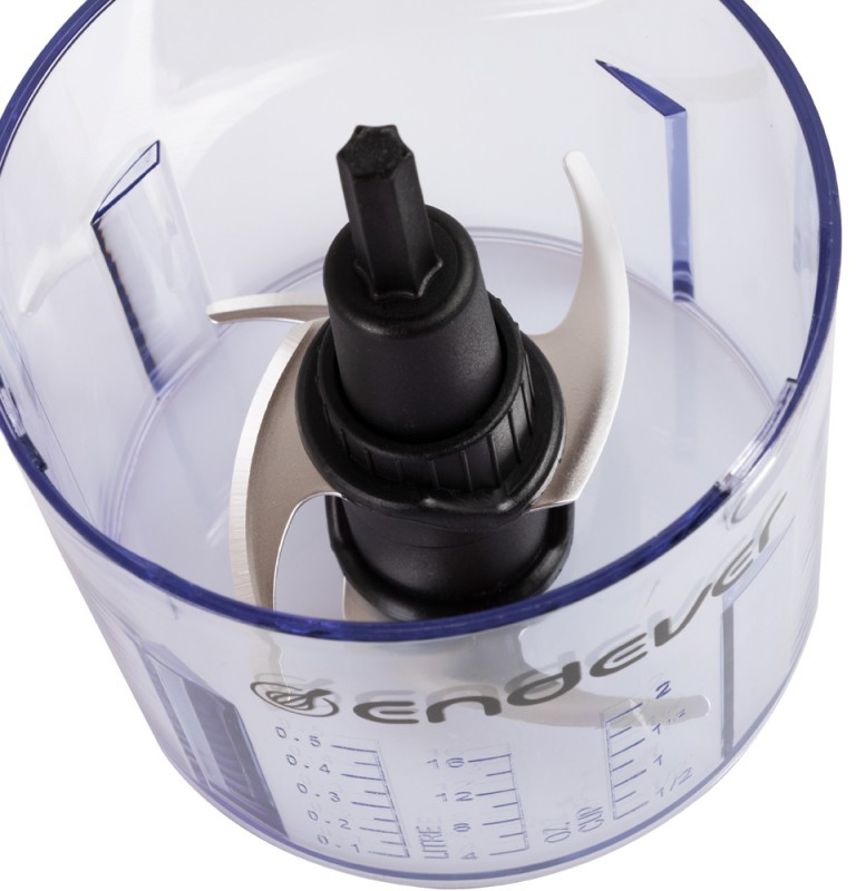 - Пластиковая чаша оснащена мерной шкалой, которая позволяет точно отмерять порционность продуктов