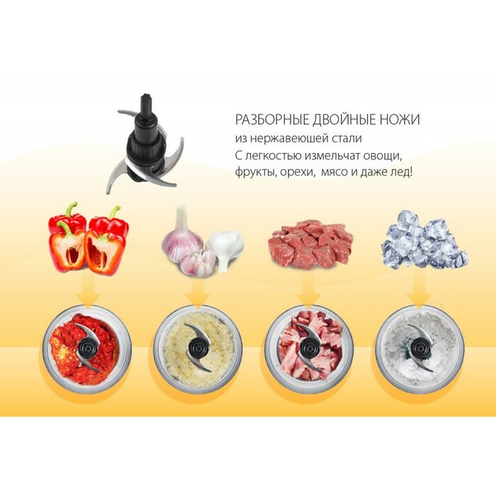 - Измельчитель Sigma-59 имеет 2 съёмных ножа из нержавеющей стали, которые не деформируются, не ржавеют, не подвержены коррозии, легко моются и имеют максимально длительный срок службы. А также с легкостью измельчат фрукты, орехи, мясо и даже лед
