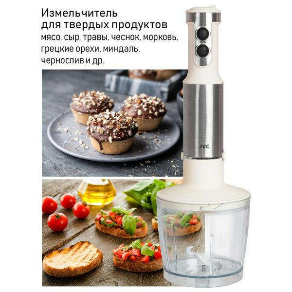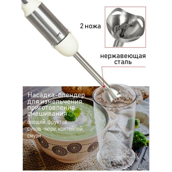 - Насадки: съемная насадка-блендер с двойным лезвием из нержавеющей стали, съемная насадка-венчик из нержавеющей стали