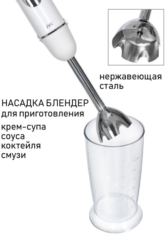 - Насадки: съемная насадка-блендер из нержавеющей стали, съемная насадка-венчик из нержавеющей стали