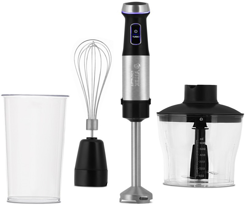 - Для приготовления блюд, требующих измельчения или взбивания ингредиентов, воспользуйтесь погружным блендером VITEK VT-8538, снабженным чашей объемом 650 мл, венчиком и высоким стаканом объемом 800 мл