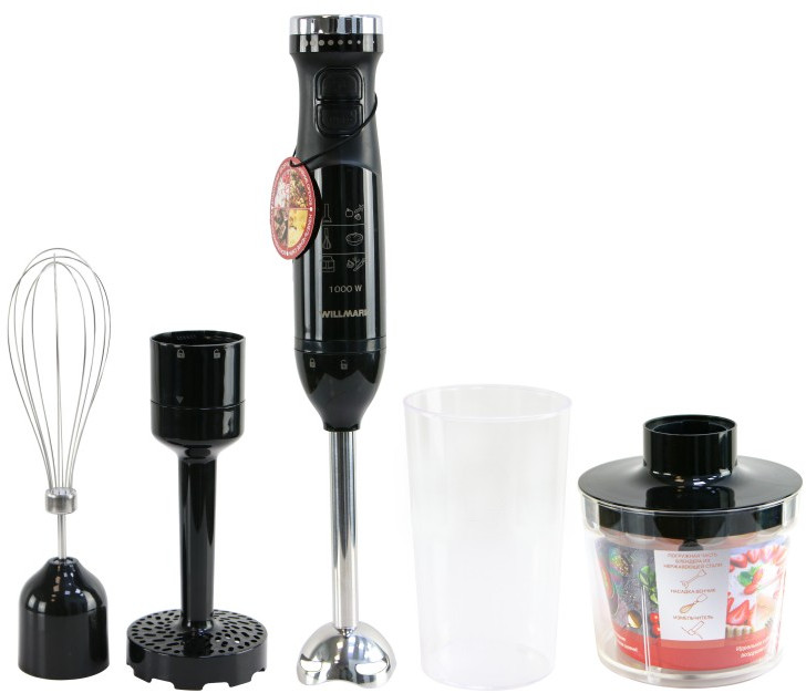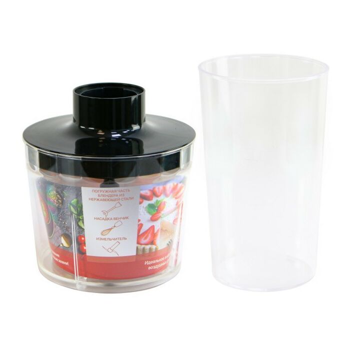 - В комплект к изделию входит стальная насадка измельчитель твёрдых продуктов – зелени, орехов или овощей, венчик для взбивания яичных белков, сливок, десертов и пластиковый стакан с мерной шкалой до 600 мл