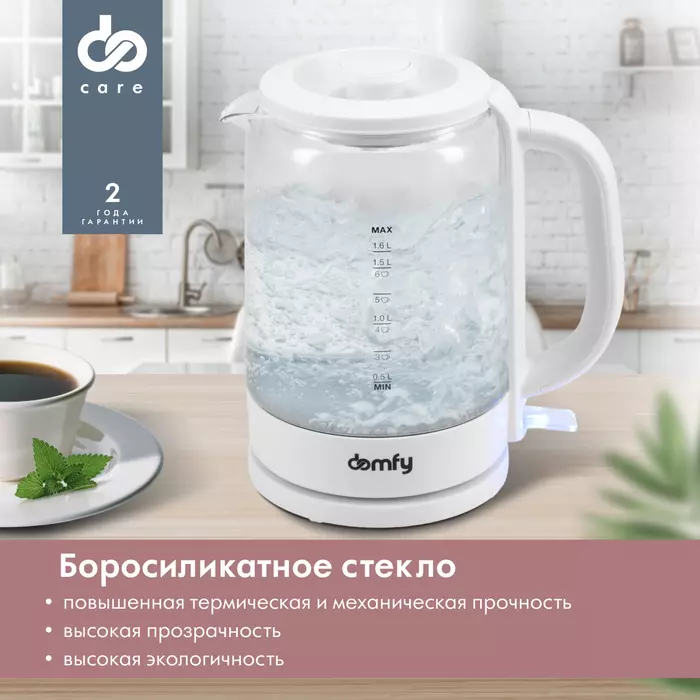Компактный и легкий стеклянный электрический чайник DOMFY DSW-EK304 объемом 1,6 литра является образцом сочетания практичности и доступности. Эта модель изготовлена из материалов, обладающих высокой стойкостью к механическим и термическим воздействиям, проста в эксплуатации и не займет много места на кухне.