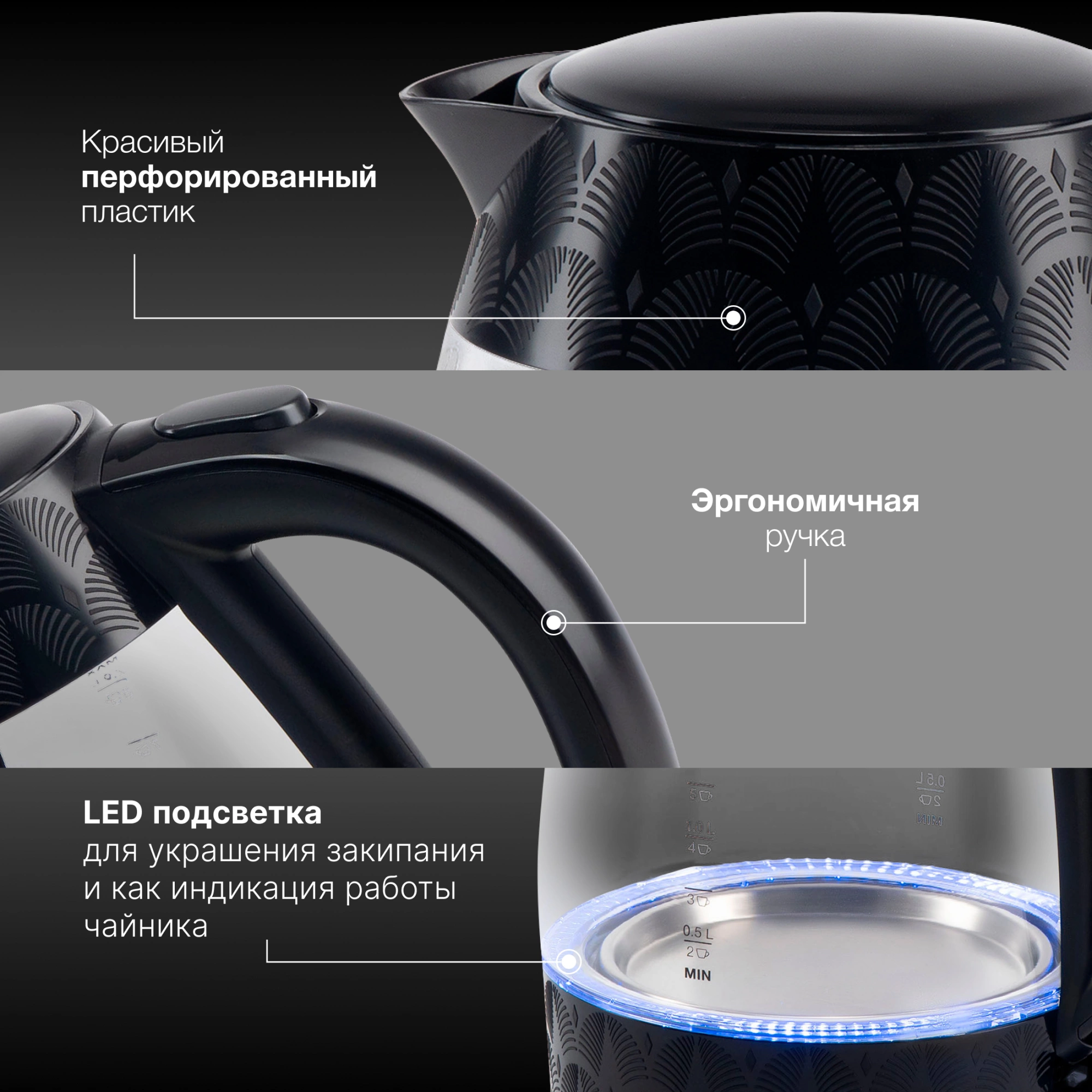 Конструктивные особенностикнопка открытия крышки, подсветка воды, подставка 360, фильтр от накипи