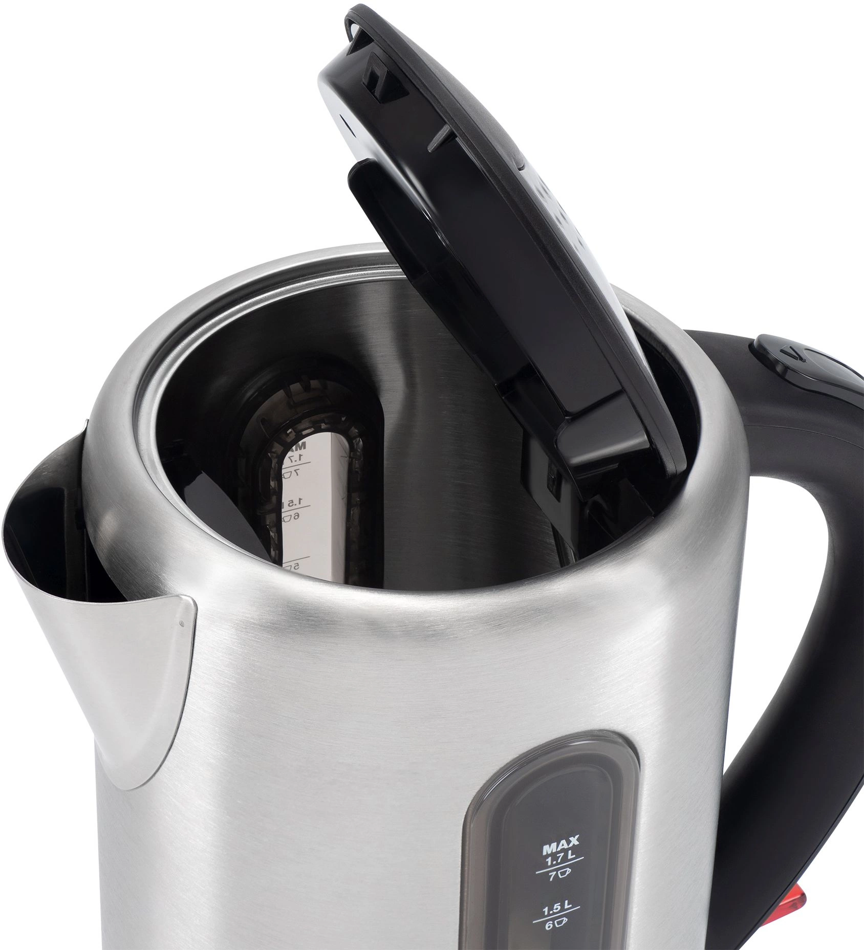 | Особенности | Крышка открывается на 75° для удобства заполнения и/или очистки чайника. Съемный фильтр от накипи, шкала уровня воды с указанием количества чашек с двух сторон для удобства. |