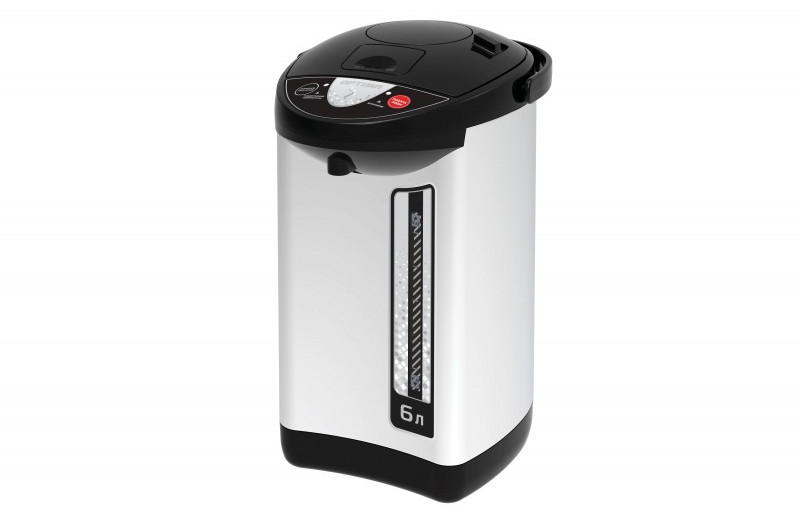 - Поттер имеет объем 6,0 литров, оснащен индикаторами уровня воды и нагрева, функцией поддержания температуры и защиты от перегрева