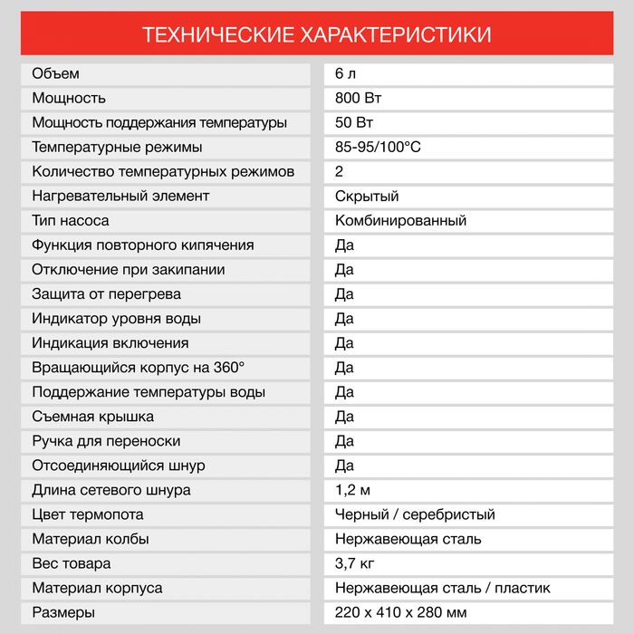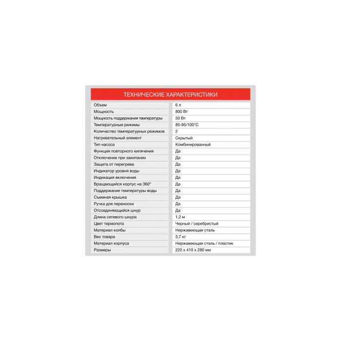 Характеристики Основные характеристики Объем 6 л Мощность 800 Вт Мощность поддержания температуры 50 Вт Температурные режимы...