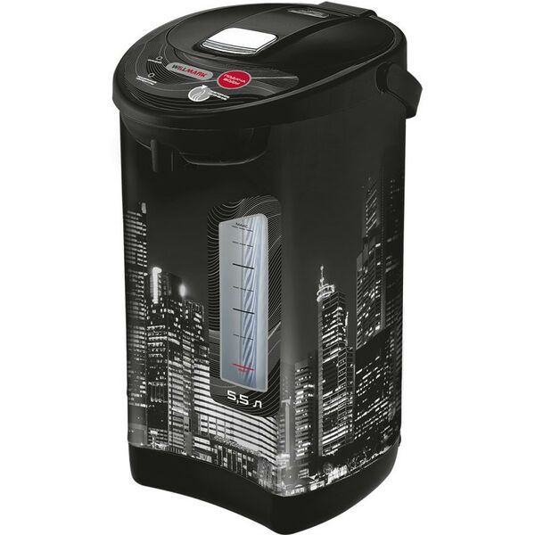 - На передней панели установлена стильная шкала с минимальными и максимальными обозначениями уровня воды в приборе. Ёмкость для нагрева воды из нержавеющей стали объемом 5,5 литра. В верхней части корпуса расположена крышка с отверстием для выпуска пара при кипячении, а также хромированная оригинального дизайна кнопка, нажатием на которую открывается сама крышка. Сама крышка съёмная, для удобства чистки прибора. Чайник-термос снабжён пластиковой ручкой для удобства переноса