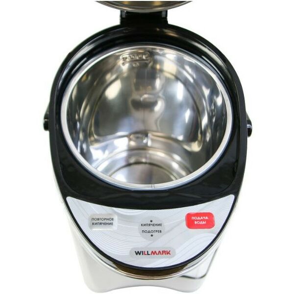 - На панели управления расположены два световых индикатора. Индикатор «поддержание температуры» сигнализирует о готовности чайника-термоса к работе, индикатор «кипячение» показывает процесс нагрева воды. Также наполнить чашку водой можно нажатием на рычаг, находящийся под носиком прибора