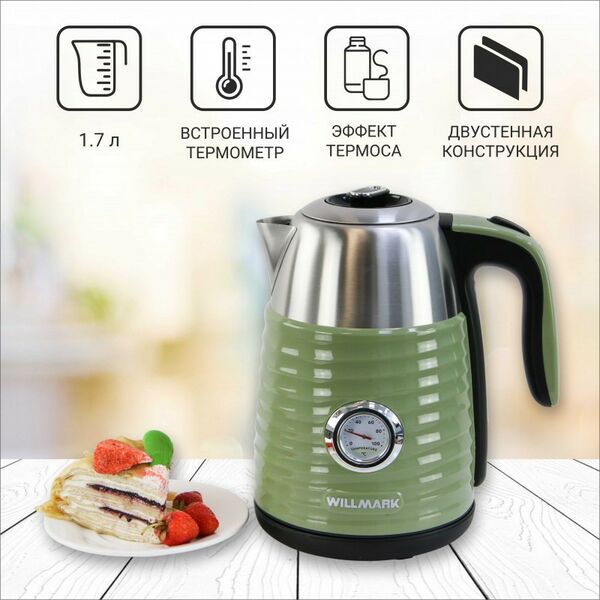 • Чайник электрический имеет двухстенную конструкцию, в которая наружняя часть выполнена из экологически безопасного пищевого пластика, внутренняя - из нержавеющей стали