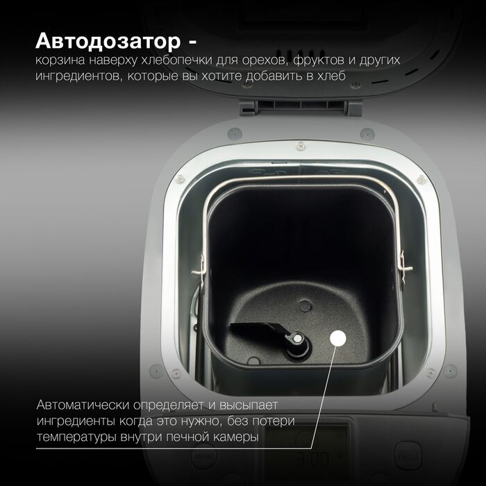 | Особенности хлебопечи | антипригарное покрытие формы, диспенсер, окно контроля процесса |