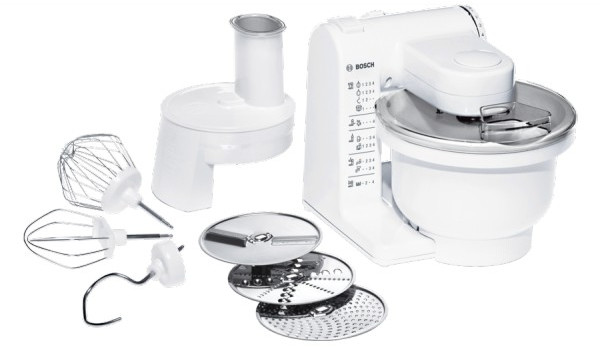 - Комбайн, крюк для теста, венчик для жидкого теста, венчик для взбивания, универсальная резка с 3 режущими дисками (двусторонняя терка, двусторонняя шинковка, терка для сыра/ шоколада/ орехов), руководство пользователя, упаковка.