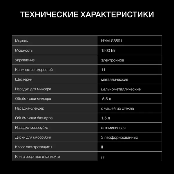 | Комплектация | кухонная машина; чаша; защитная крышка для чаши; насадка-венчик; насадка-крюк; насадка-лопатка; насадка-блендер; насадка-мясорубка; 3 диска для фраша; книга рецептов; инструкция с гарантийным талоном |