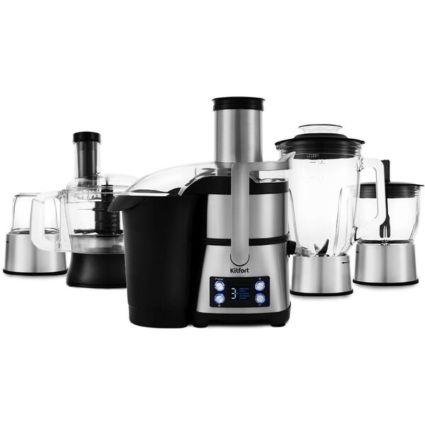 ОсобенностиКухонный процессор КТ-1395 сочетает в себе функции 11 устройств: тёрка, шинковка, соломорезка, блендер и кофемолка, центробежная соковыжималка и соковыжималка для цитрусовых, измельчитель для мяса, насадка для жидкого теста, насадка в виде ножа и мутовка.