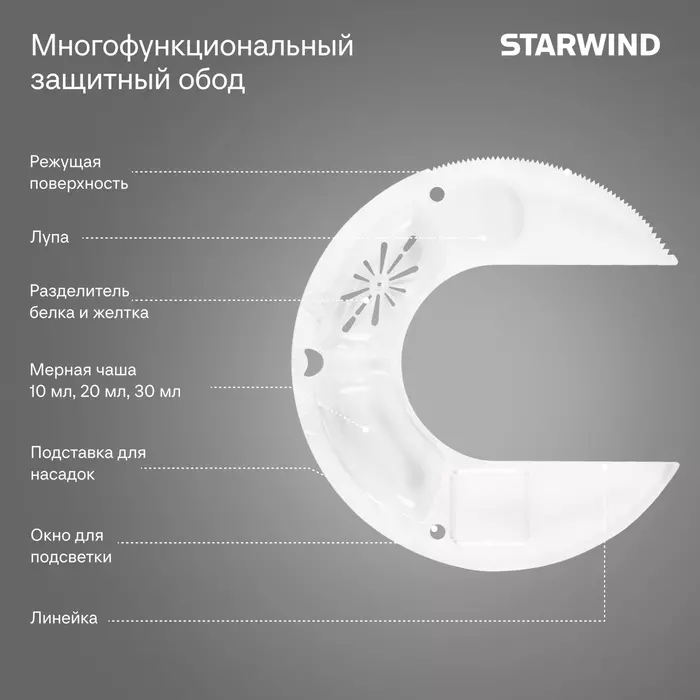 | Особенности | Мультифункциональный обод: режущая поверхность + разделитель белка и желтка + ёмкость для добавления ингредиентов + отверстие для хранения насадок + подставка под фонарик + линейка |