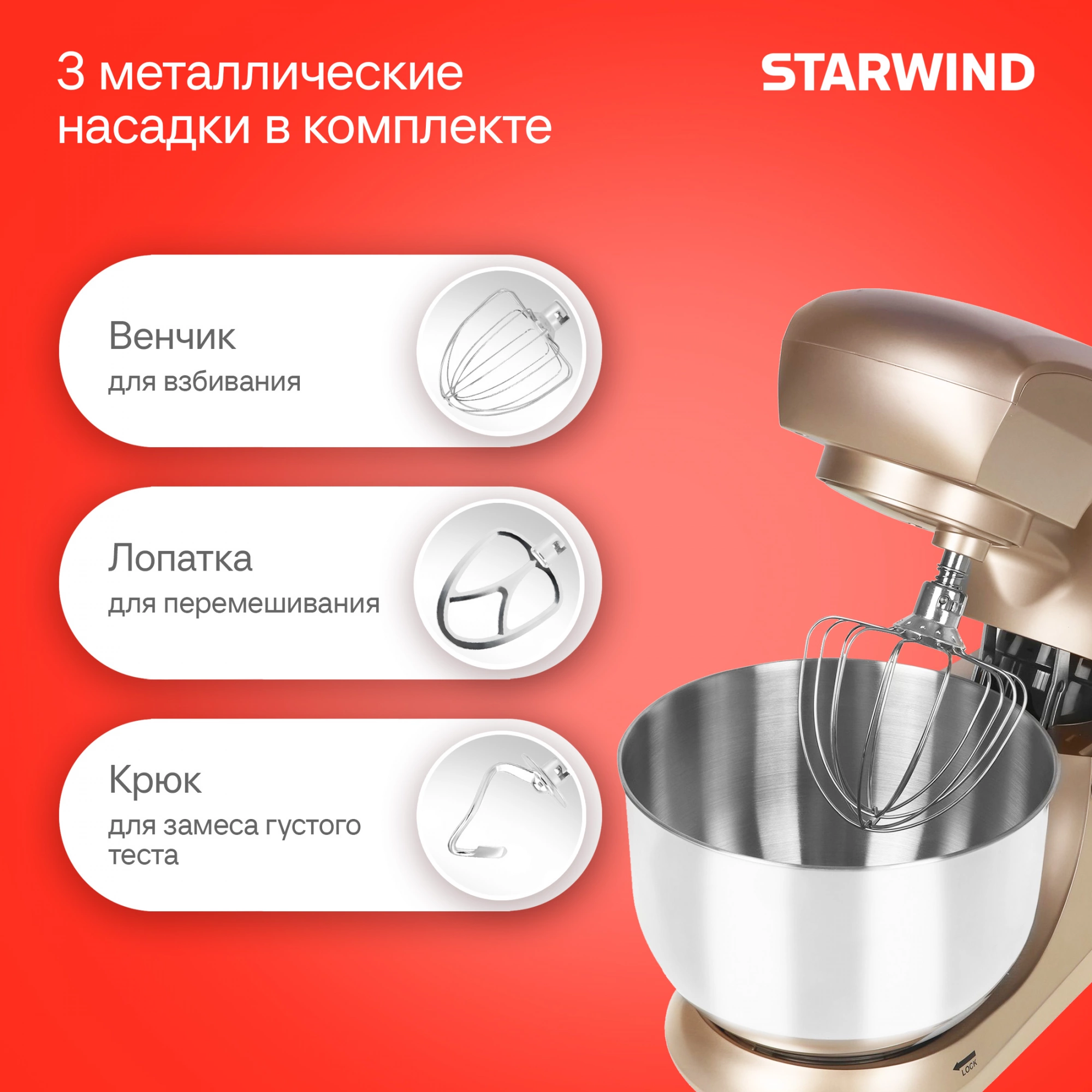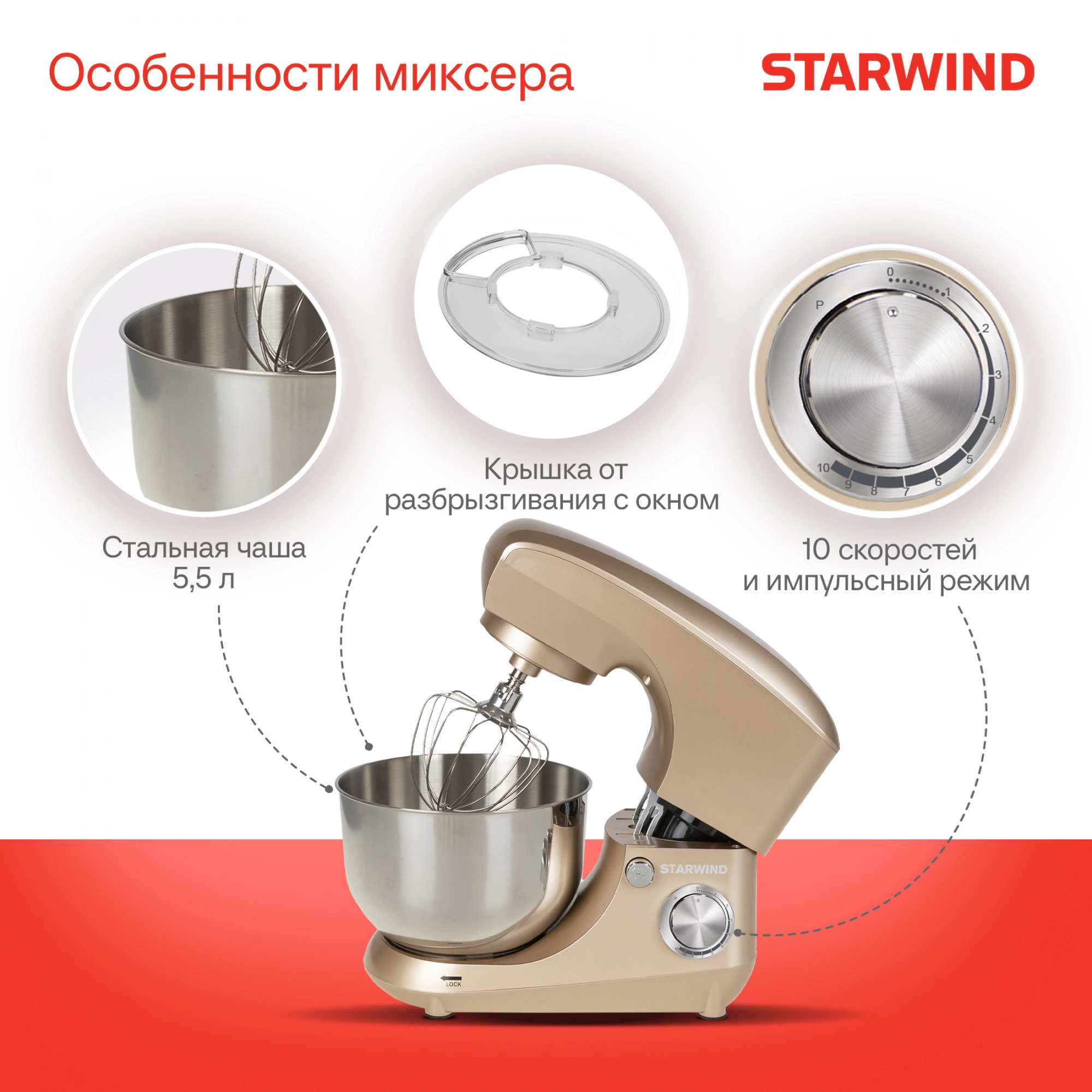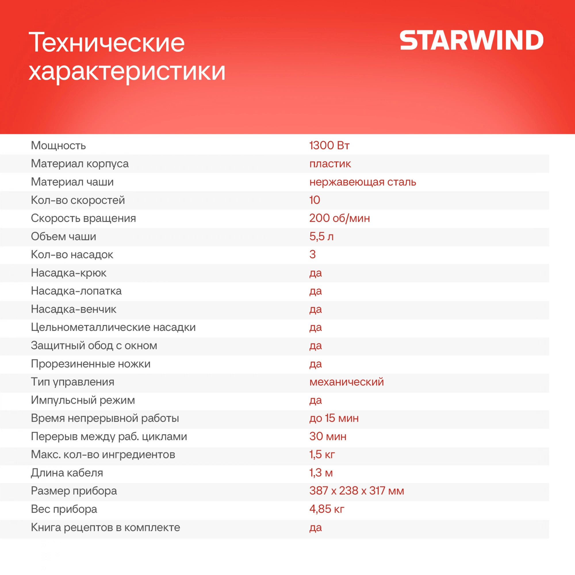 | Комплектация | Миксер; чаша; защитная крышка для чаши; насадка-венчик; насадка-лопатка; насадка-крюк; руководство пользователя с гарантийным талоном; книга рецептов |