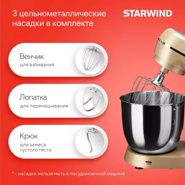 | Комплектация | миксер; чаша; защитная крышка для чаши; насадка-венчик; насадка-крюк; насадка-лопатка; книга рецептов; инструкция с гарантийным талоном |