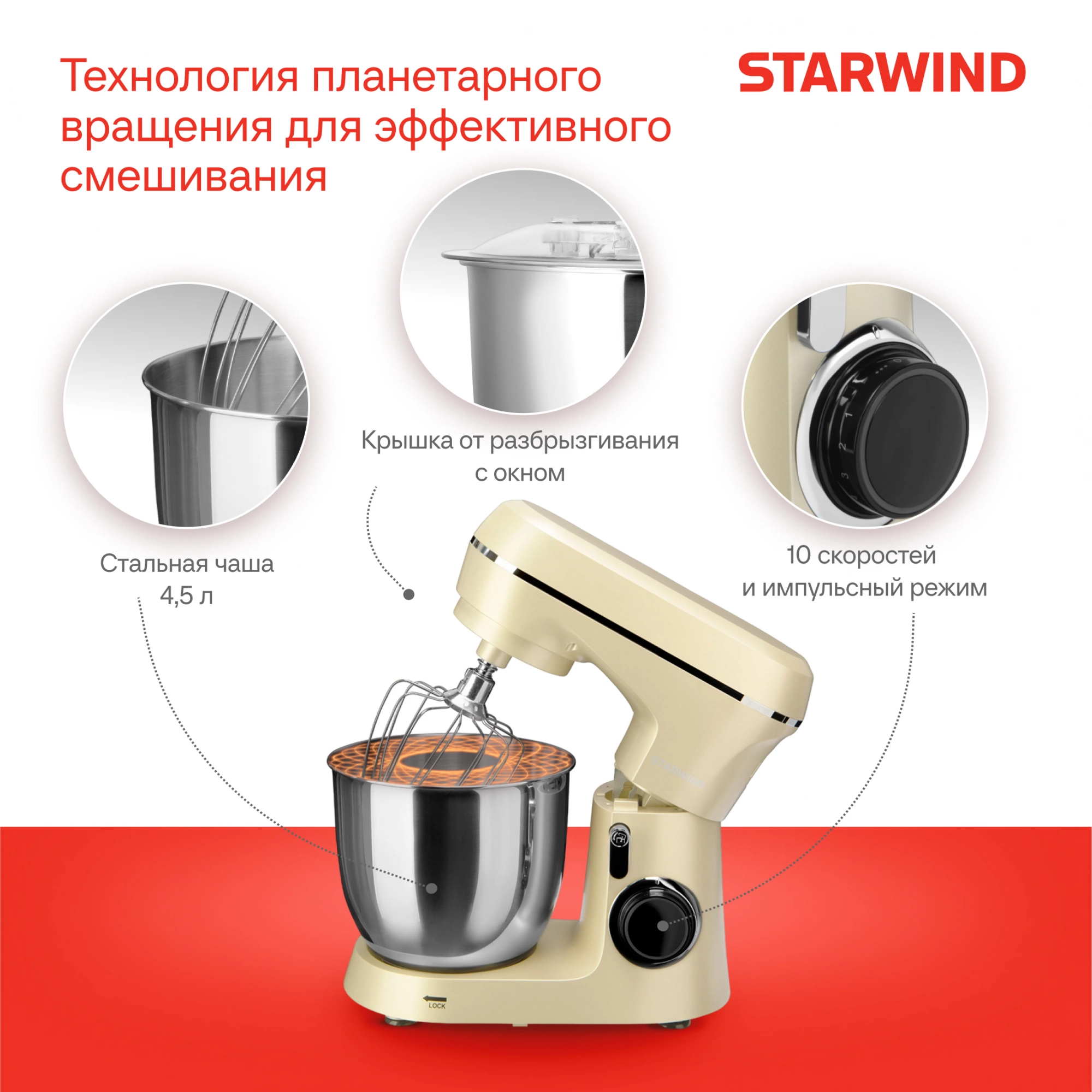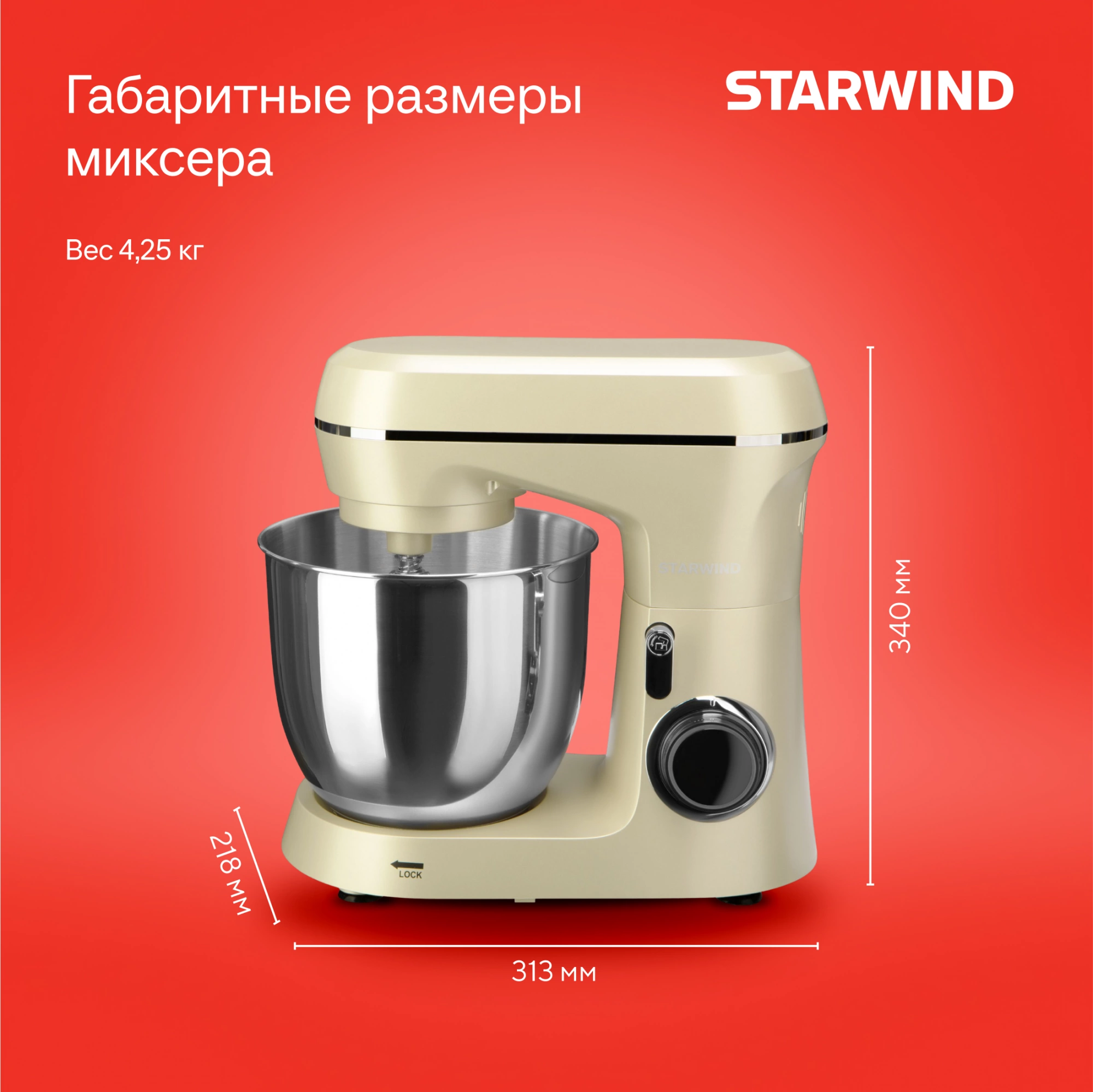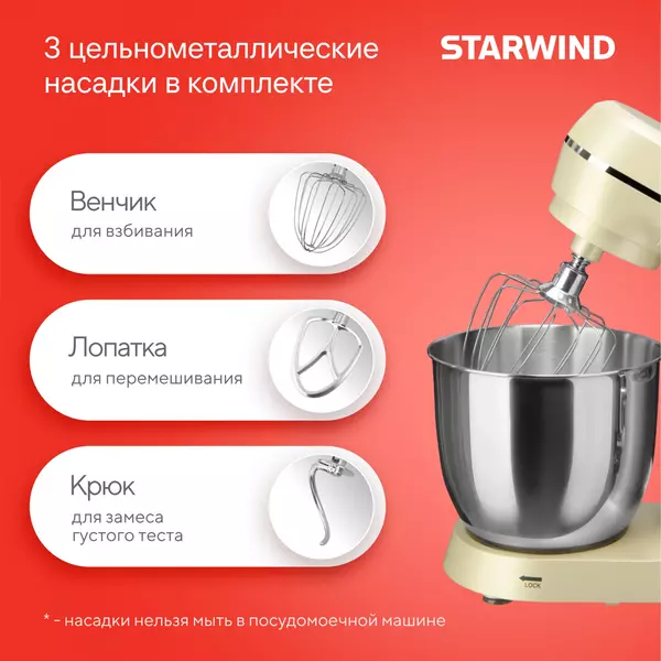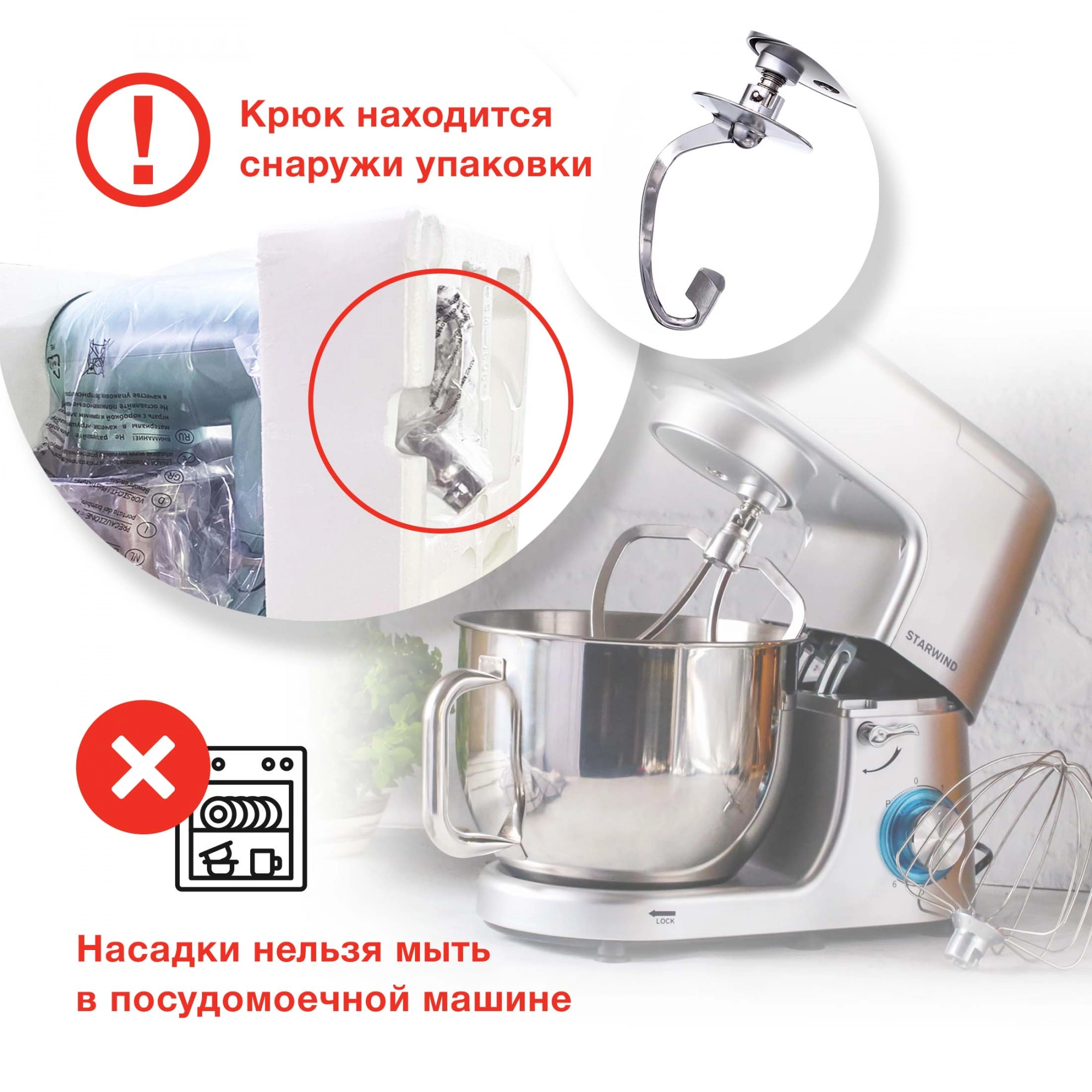 | Комплектация | миксер; чаша; защитная крышка для чаши; насадка-венчик; насадка-крюк; насадка-лопатка; книга рецептов; инструкция с гарантийным талоном |