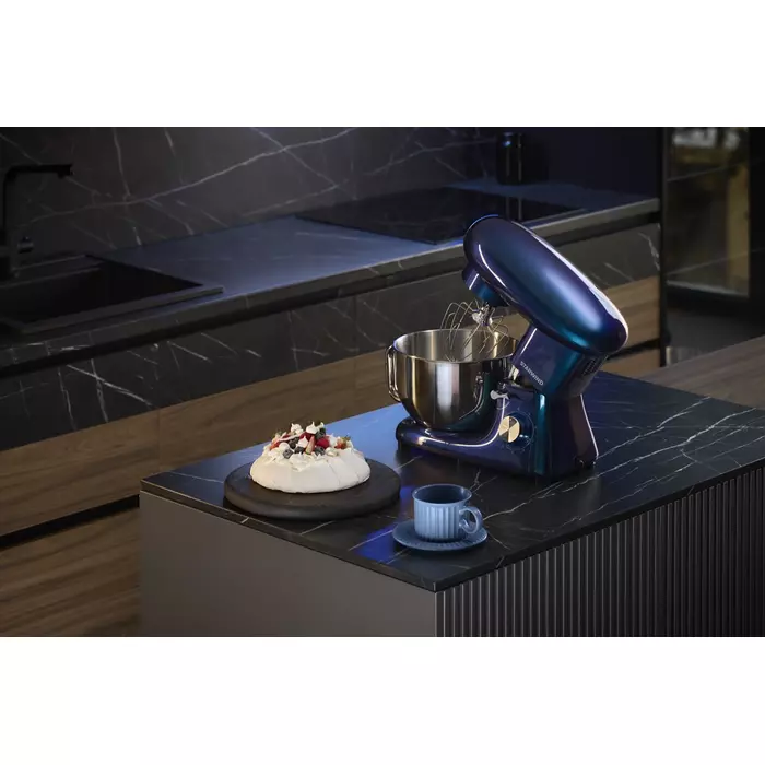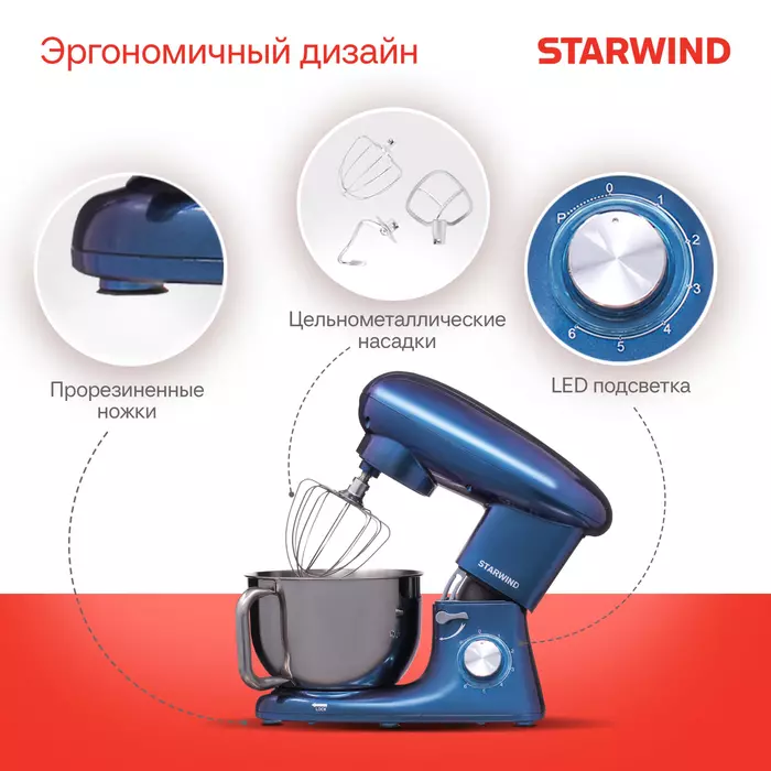 | Комплектация | Миксер; чаша; защитная крышка для чаши; насадка-венчик; насадка-лопатка; насадка-крюк; кулинарная силиконовая лопатка; книга рецептов; инструкция с гарантийным талоном |