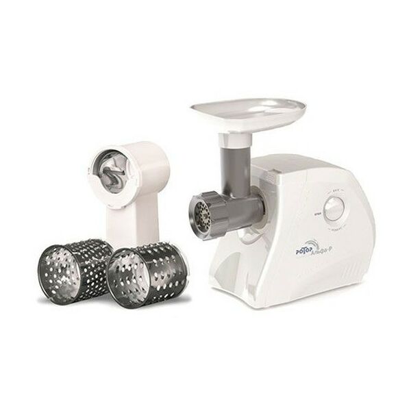 - Электрическая мясорубка Ротор Альфа-Р поможет приготовить мясной и рыбный фарш, а также натереть, нашинковать или тонко нарезать овощи, фрукты и сыр. Тип мясорубки – шнековый.