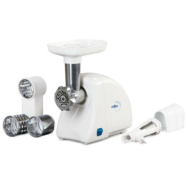 - Тип мясорубки — шнековый, возможна комплектация разнообразными насадками (для получения сока, для резки и шинковки овощей, терка). Данная модель снабжена функцией "реверс": для предотвращения уплотнения продуктов внутри мясорубки предусмотрен режим обратного вращения шнека