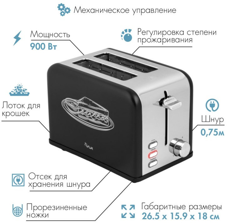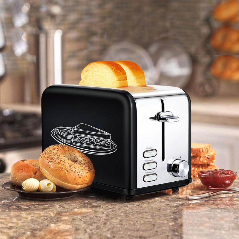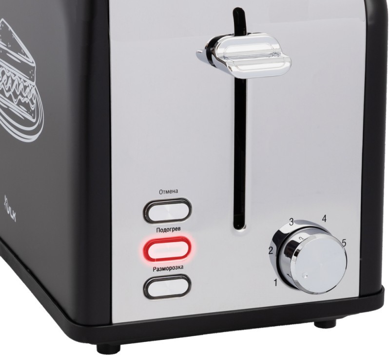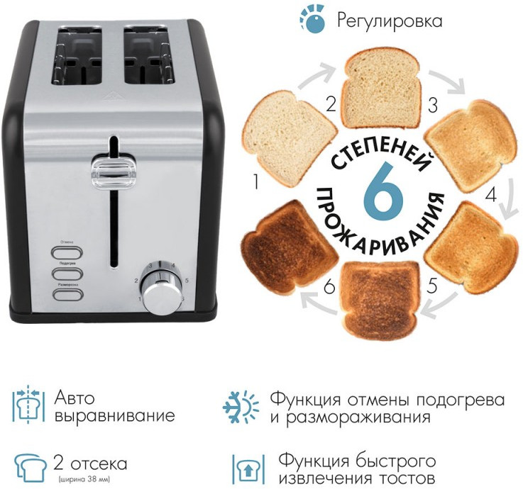 - Тип управления: механический, 2 отсека загрузки тостов (ширина 38 мм), 6 степеней прожаривания