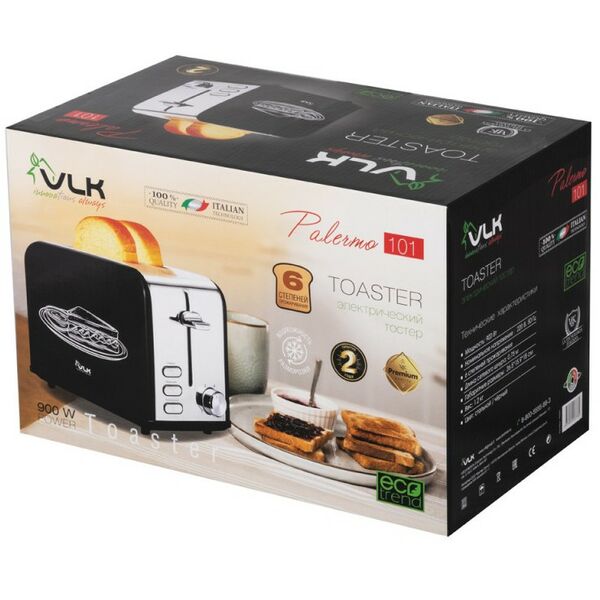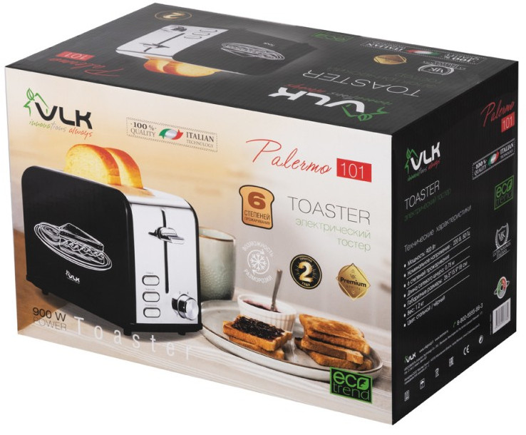 - Строгий, элегантный вид нашего нового электрического тостера VLK Palermo 101 не оставит Вас равнодушным к данной модели. Благородный черный цвет в сочетании со стальной вставкой на корпусе заставят обратить внимание на себя Ваших гостей