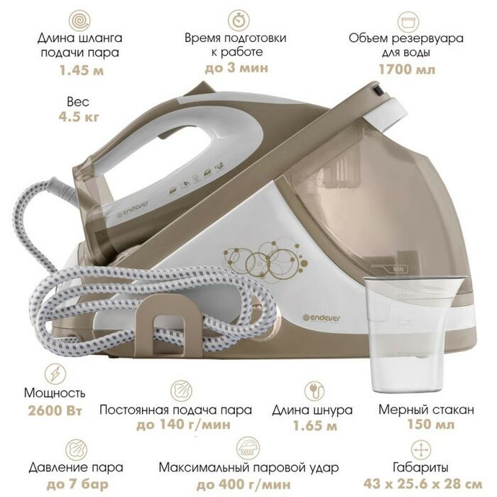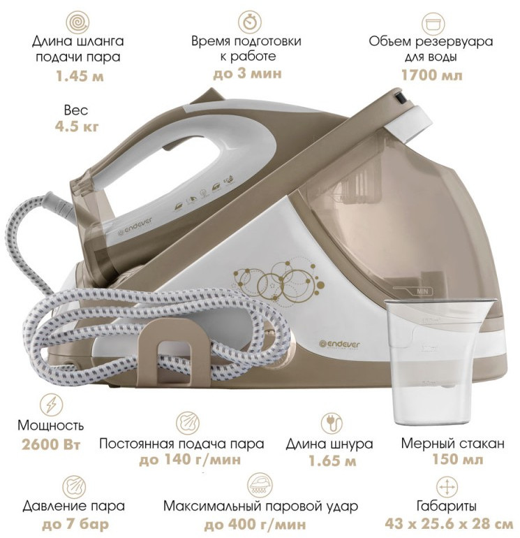 Представляем Вашему вниманию электрический парогенератор ENDEVER DELTA-400, который сделает Ваши вещи идеально гладкими без риска прожечь ткань. Мощный парогенератор создает давление до 7 бар, что позволяет делать уход за Вашими вещами более удобным и быстрым, поскольку способен погладить стопку белья за один раз с таким феноменальным паровым ударом 400 г/мин. Постоянная подача пара составляет до 140 г/мин, что гораздо больше по сравнению с обычным утюгом