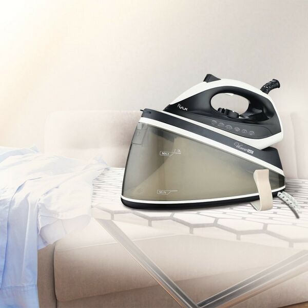 - Для удобства переноски и хранения парогенератора предусмотрены система фиксации утюга на корпусе парогенератора и система хранения сетевого шнура