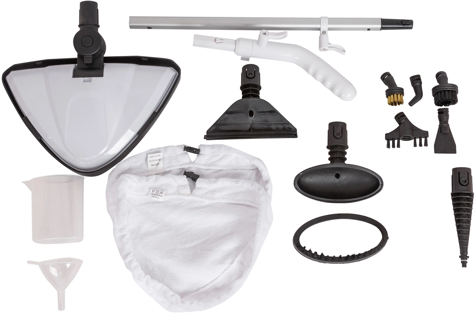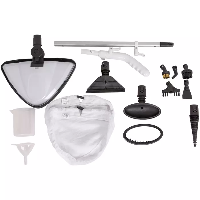 | Комплектация | Швабра, мерный стакан, воронка, насадка для очистки ковров, насадка для очистки пола, конусная насадка, металлическая щетка, нейлоновая щетка, насадка скребок, изогнутая насадка, для очистки межплиточных швов, насадка для отпаривания, микрофибра, дополнительная щетка, для окон. |