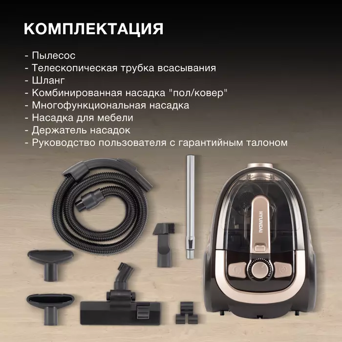| Аксессуары в комплекте | насадка для пола и ковров, щелевая насадка, щетка |