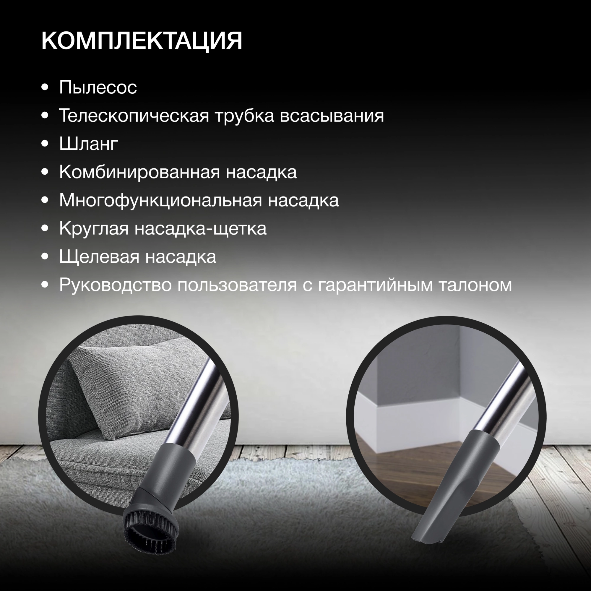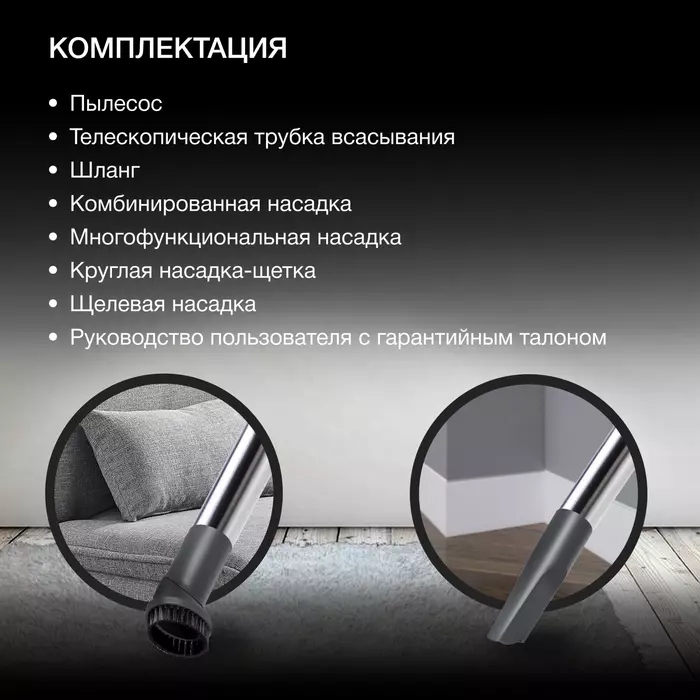 Насадки в комплектещелевая насадка, многофункциональная насадка, круглая насадка-щетка, комбинированная насадка