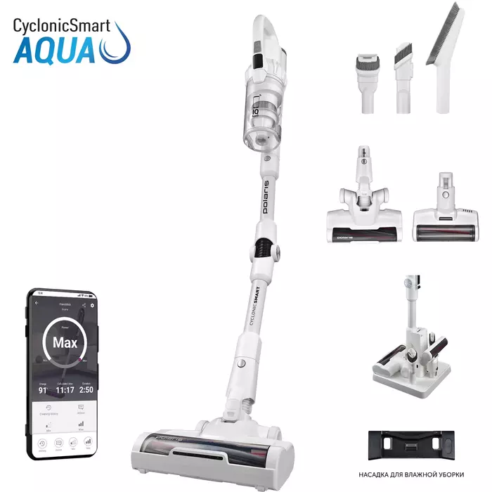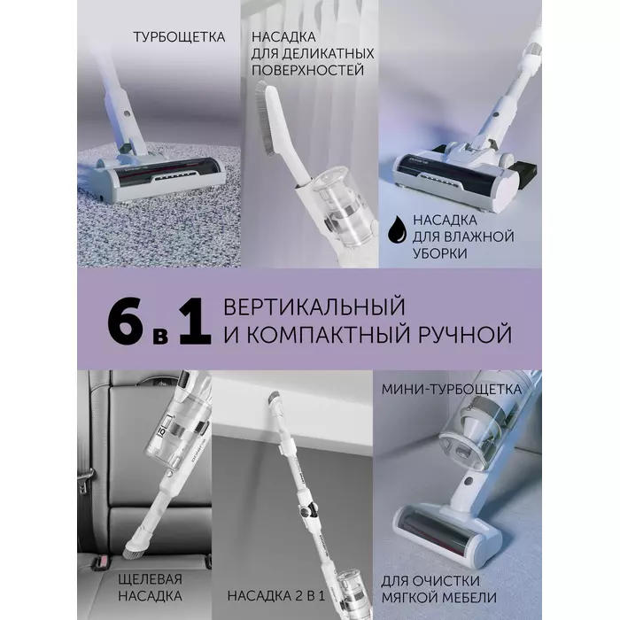 | Аксессуары в комплекте | насадка для влажной уборки ковров/полов, насадка для мягкой мебели, насадка для пола и ковров, турбощетка, щелевая насадка |