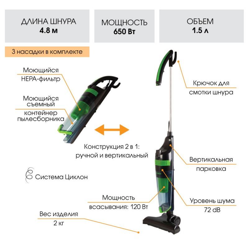 Пылесос, Универсальная щетка для ковров и твердых полов, Удлиненная щелевая насадка, Ворсовая щетка, Переходник, HEPA-фильтр, Руководство по эксплуатации, Гарантийный талон