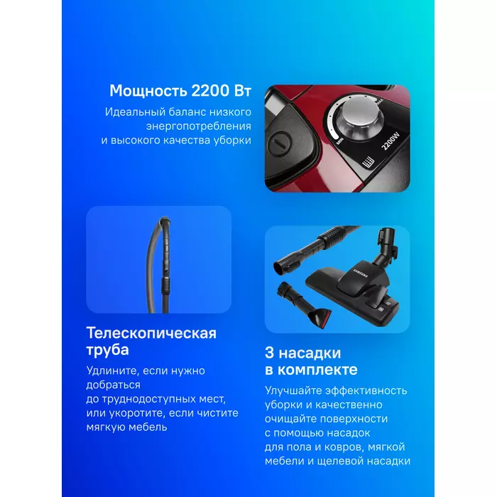 | Особенности пылесоса | легко очищаемый пылесборник, поворачивающиеся колеса, шланг |