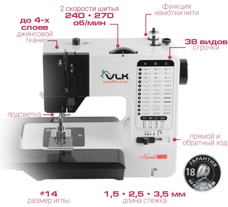 - Скорость шитья: 240 - 270 об/мин