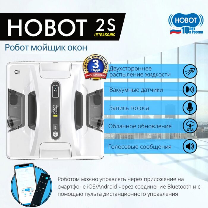 | Комплектация | робот Hobot-2S Ultrasonic; страховочный шнур; пульт дистанционного управления; адаптер питания; кабель питания переменного тока; удлинитель постоянного тока; чистящая жидкость (220 мл.); ультразвуковой распылитель Ultrasonic; чистящие салфетки (3 шт.); руководство пользователя, гарантийный талон. |