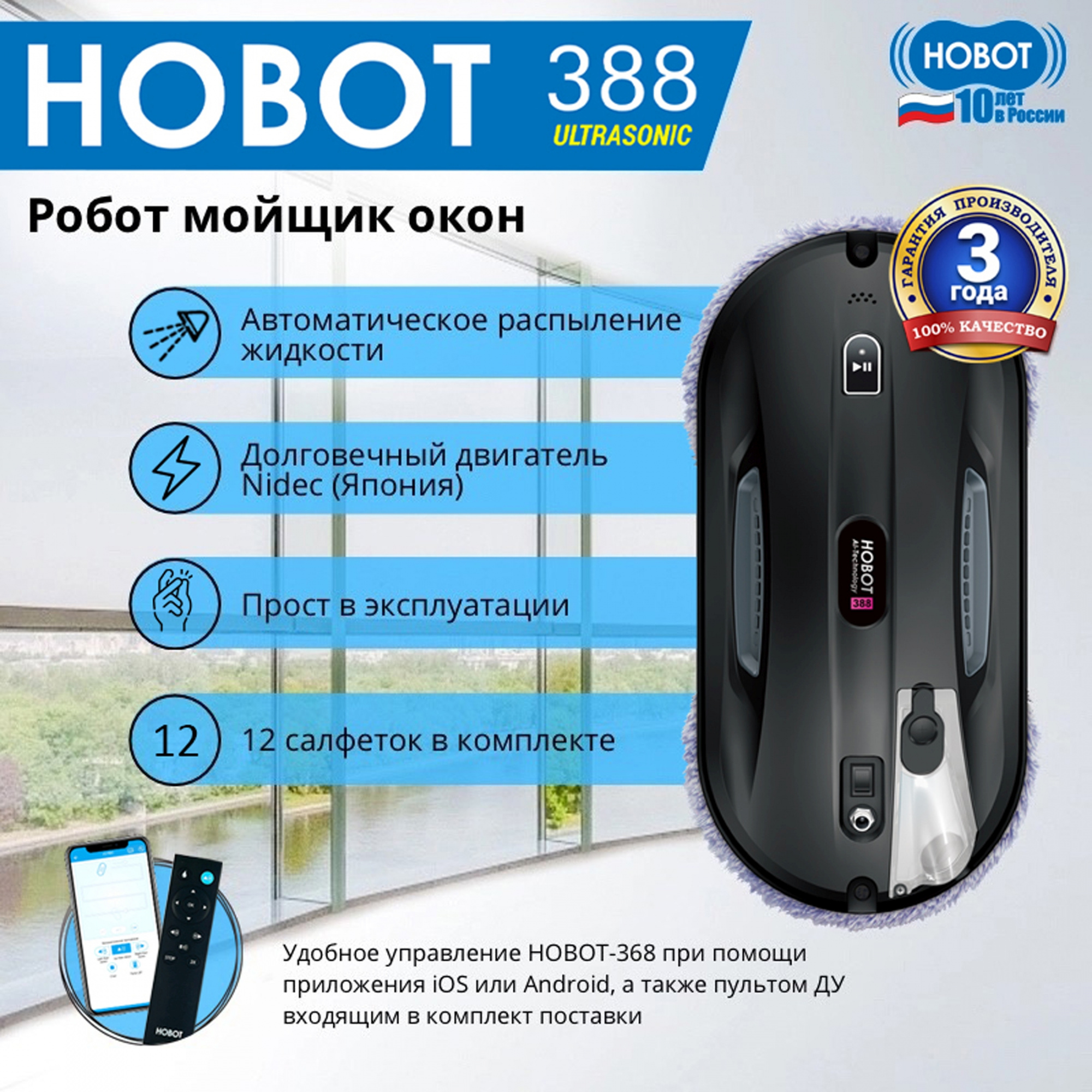 | Комплектация | Робот HOBOT-388, страховочный шнур, пульт ДУ, адаптер питания, кабель питания, удлинитель, чистящие салфетки из микрофибры (12 шт. + 2 шт. на роботе), кольцо для салфеток (2 шт. + 2 шт. на роботе), ультразвуковой распылитель, чистящая жидкость (220 мл.), руководство пользователя, гарантийный талон |